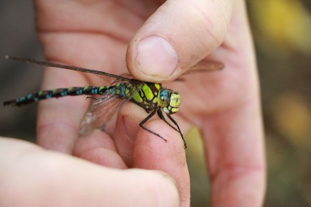 oben: Lebensweise der Wasserinsekten wird praxisnah erläutert, hier Bsp. Libellen (Blaugrüne Mosaikjungfer)